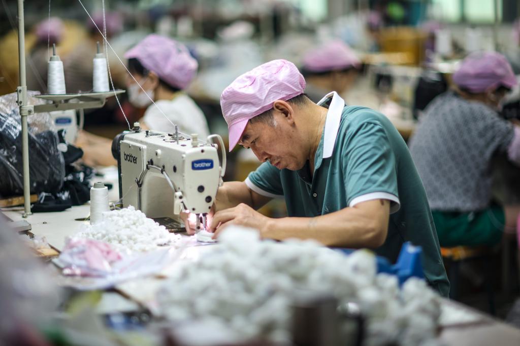 8月11日,在广东东莞奇骏玩具工厂,工人将布料根据图纸进行裁切,经过车缝后,变成半成品——“外衣”。新华社发(郑家雄 摄)