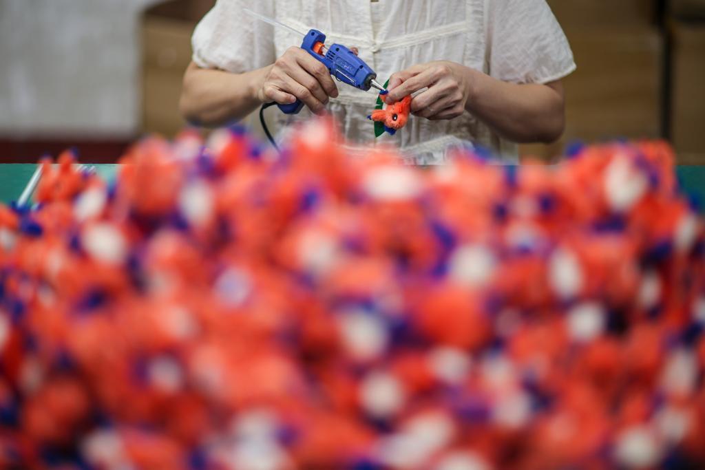 8月11日,在广东东莞奇骏玩具工厂,工人为包挂封口。新华社发(郑家雄 摄)