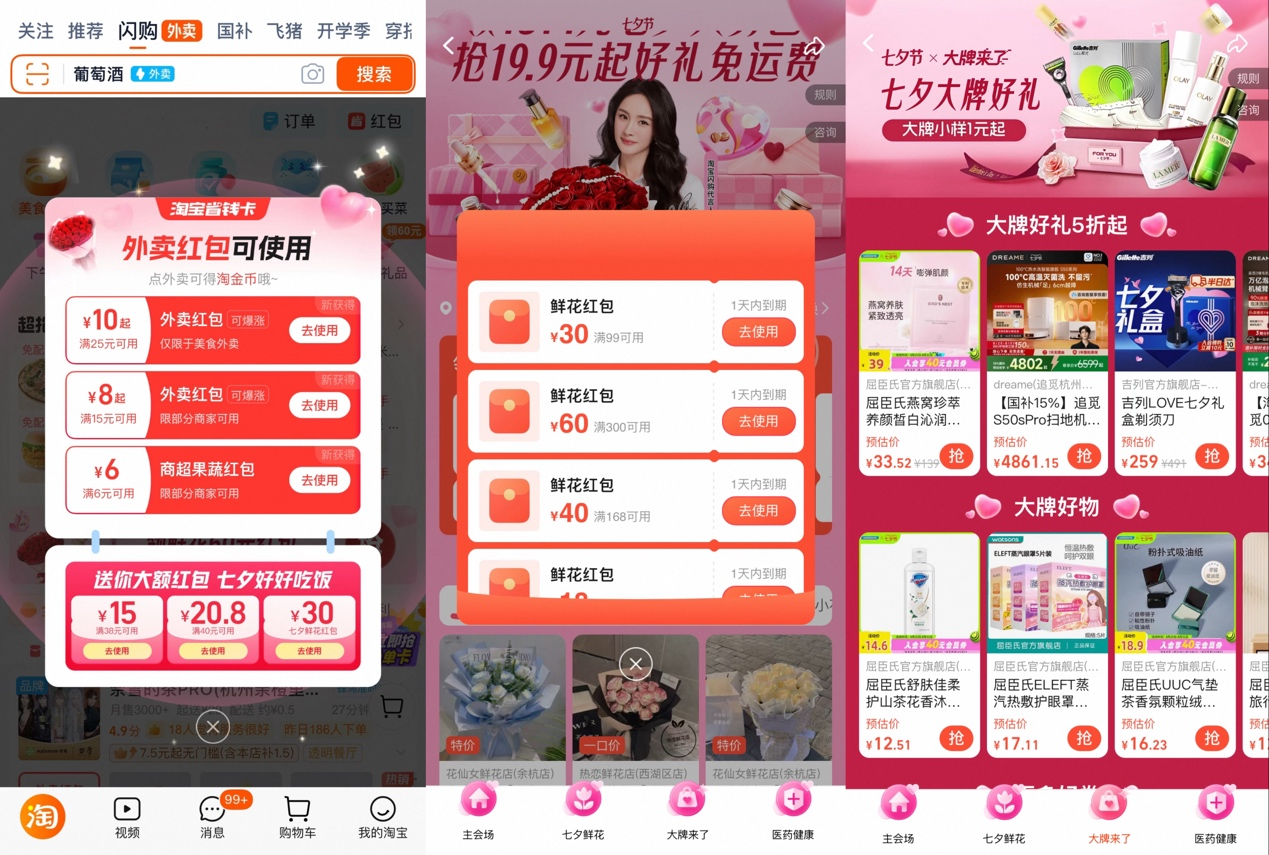 消费者打开淘宝App,进入闪购频道,就能领取大额七夕鲜花礼品红包。除鲜花外,还可以下单轻奢包包、美妆护肤、黄金饰品、3C数码、潮流玩具等礼品送给爱人。仪式感消费也成为七夕送礼一大趋势。葡萄酒、香氛香薰、情侣家居服等淘宝闪购订单增幅显著。
