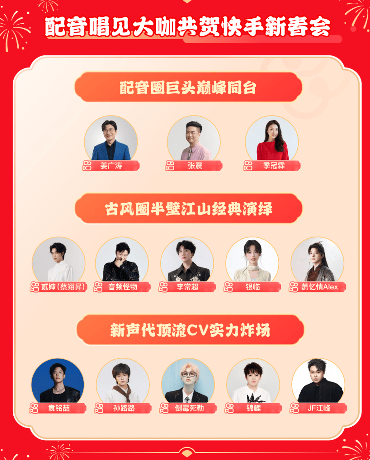 本次新春会堪称顶配阵容集结,12位顶流嘉宾覆盖国民声优、国风唱将与新生代配音演员。姜广涛、季冠霖、张震等资深声优坐镇,李常超、银临、音频怪物、萧忆情Alex、贰婶(蔡翊昇)等古风大咖献声,锦鲤、倒霉死勒、袁铭喆、孙路路等新生代人气CV强势加盟,实现配音圈与古风圈首次大规模同框联动,让用户留言感慨“喜欢的声优和歌手同框,以前幻想过的画面在快手实现了。”