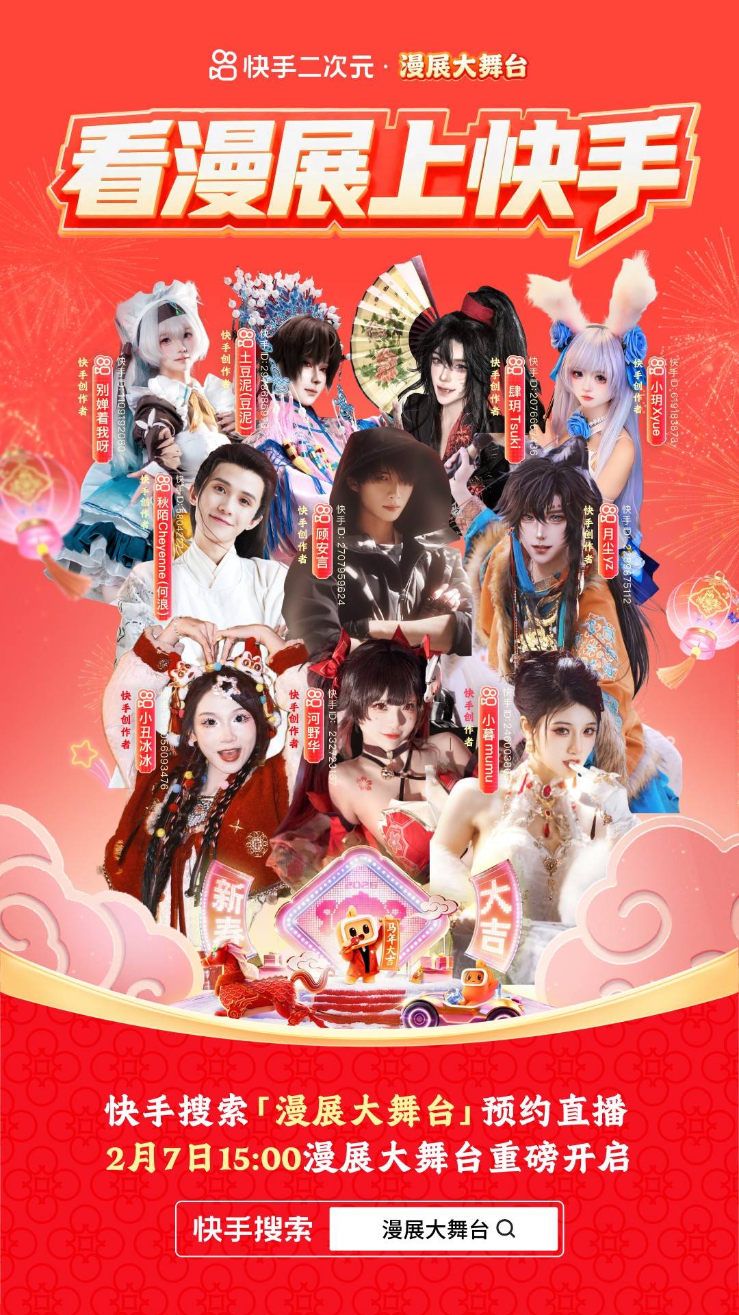 春节是阖家团圆的传统佳节,也是年轻文化与民俗仪式碰撞交融的黄金时刻。2026马年春节期间,快手以二次元新春会与漫展大舞台两大核心活动,打造贯穿线上线下的快手二次元新春会 ,用声优盛宴、国风金曲、漫展实景、COS秀场,为二次元用户献上专属“电子年夜饭”,以年轻化表达重新定义二次元新春仪式感。