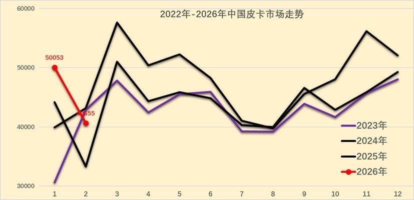 2025年皮卡批发市场走势不断变化,年末走强明显。相对于历年的春节早,因此2025年2-3月的皮卡走势因春节较晚因素获得增量,4-8月的皮卡销量逐步下滑,10-12月出口销量回升明显。由于政策影响不明显,2026年1月皮卡实现较强增长,2月春节因素的皮卡销量稍有下降。
